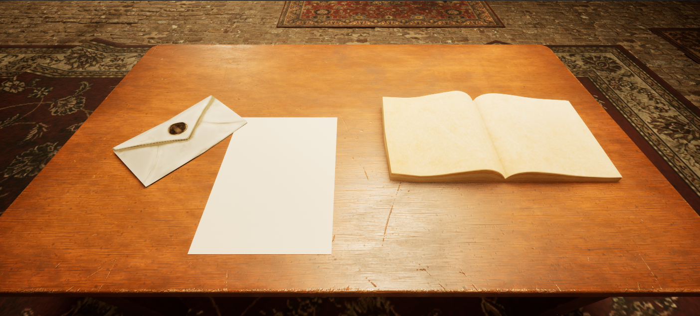 The instructions and letter contents would be generated programmatically from templates so the paper, book and letter should serve as in-world user widgets. I plan to project interactable widgets on their pages.