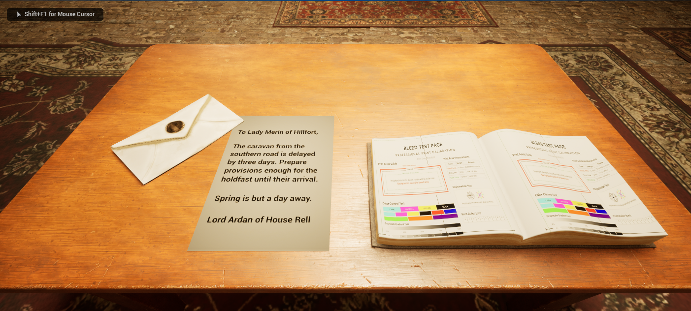 I created the widget for the letter, just a simple paper shape, with an off-white paper colored background and wrapping text. I put it in an Actor Blueprint and made and captured it with a screen capture and then used the target of that capture as a texture to create a material. The material I then applied to the paper. I didn’t get to work on the book today, but I’m happy with the progress I made on the paper. Before starting on the book I should probably make sure I can interact with the widget using this approach. I think it’s not possible just like this, but I found some tutorials online that look promising.